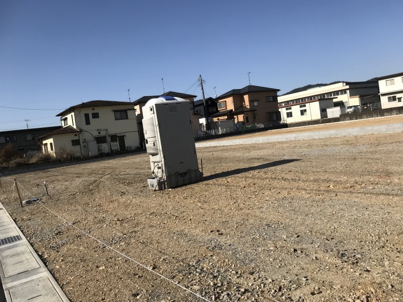 整地された後も、なかなか工事が始まらない。業者が忙しくて順番待ちであろうか。でも、ある日、この住宅建設予定地の真ん中に簡易仮設トイレがおかれた。